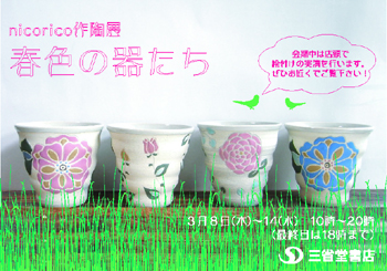 ![]() nicorico林 理子作陶展 「春色の器たち」 2012/3/8(水)〜14(水) @三省堂書店神保町本店1階 |