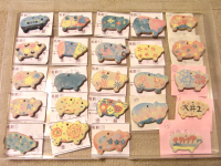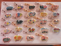 西大井第二地域センター 品川区文化祭 「ブタさんのキーホルダーをつくろう!」 2010.3.7 @西大井/東京 あらかじめ用意した素焼きのブタさんチャームに 各自、思い思いの模様を下絵で描いてもらい、 後日焼き上げてからキーホルダーに仕上げました。 参加者は5歳の小さいお子さんから、地域のお年寄りまで。 いろいろなブタさんができました。 |